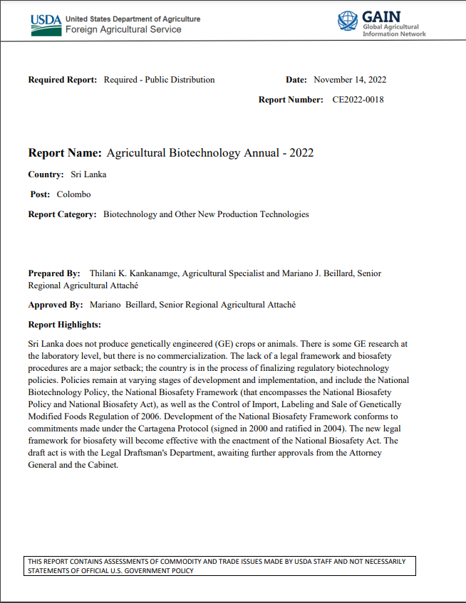 (2023) இலங்கையில் GMO உணவு உற்பத்தியை அமெரிக்க அறிக்கை உறுதிப்படுத்துகிறது மூலம்: AgricultureInformation.lk | அமெரிக்க விவசாயத் துறையின் ஆவணம்